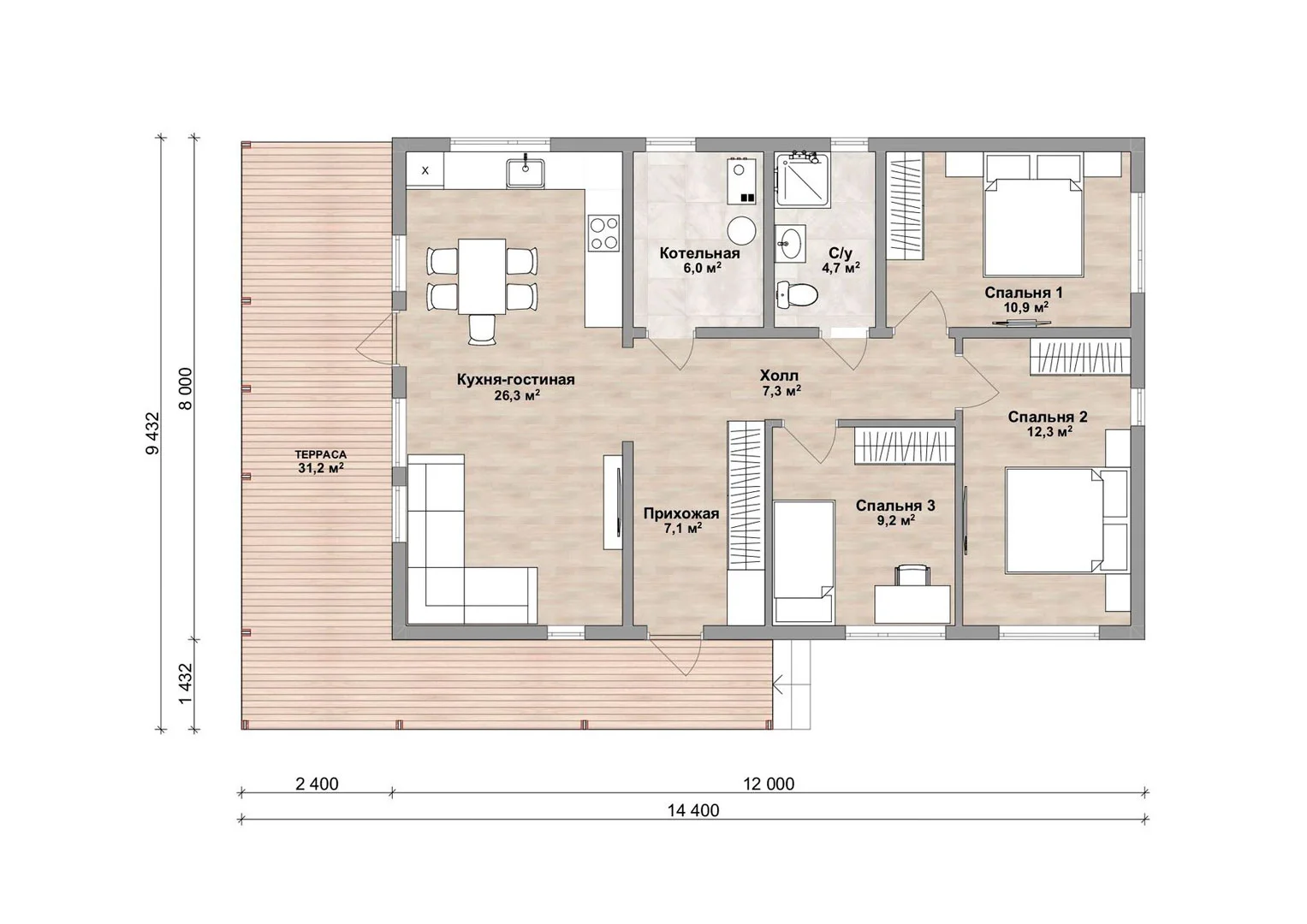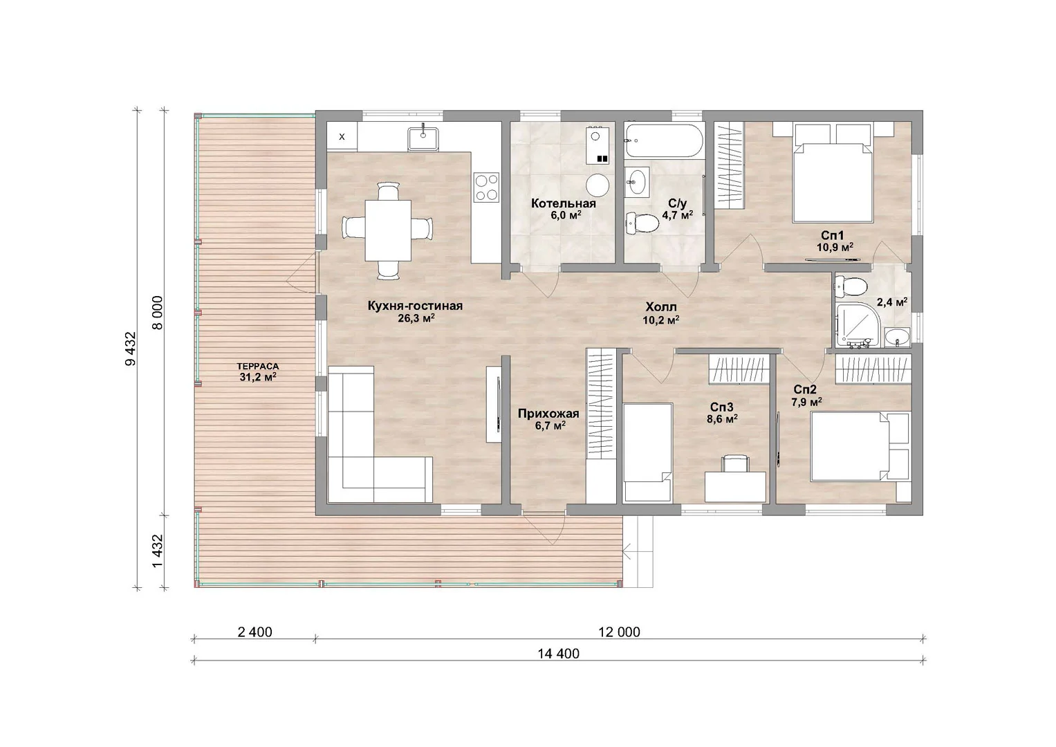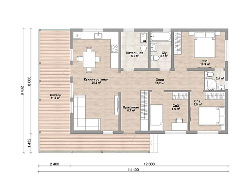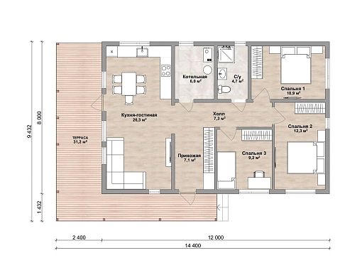 Размеры дома, м 14,4х9,4 м